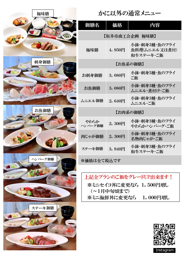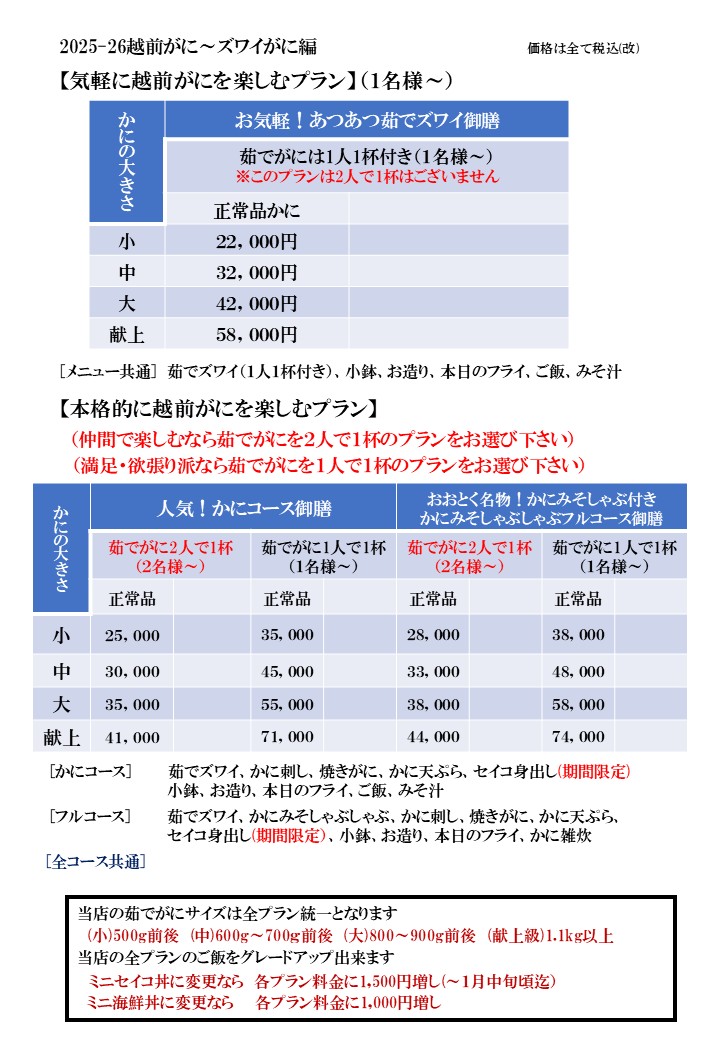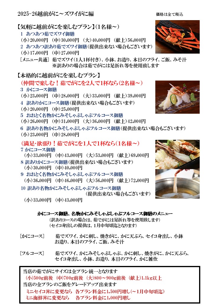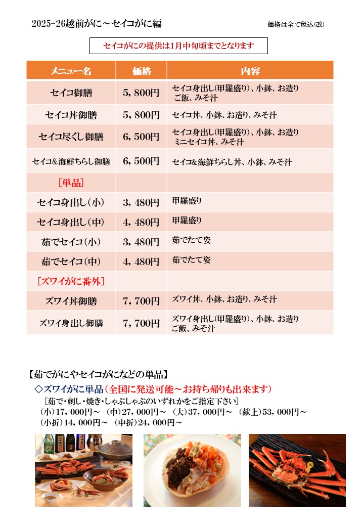 【年末年始特別メニュー】越前かにメニュー&通常メニューをご用意しております(下記メニュー表参照下さい)
